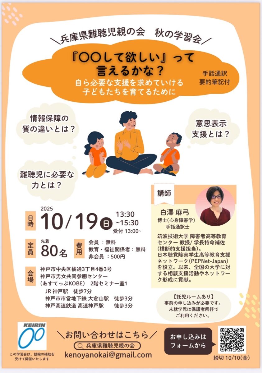 兵庫県難聴児親の会 秋の学習会 日時:2025年10月19日(日)13:30~15:30 会場:神戸市男女共同参画センター(あすてっぷKOBE) 2階セミナー室1 お問い合わせ:兵庫県難聴児親の会 チラシは、こちら